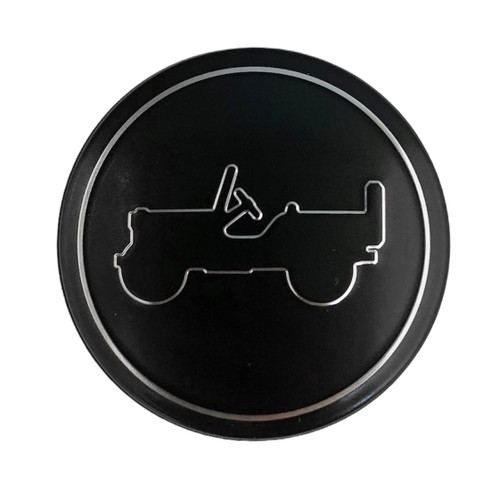 Mopar factory center cap for most factory wheels of the 2018-2025 JL Wranglers and 2020-2025 JT Gladiators. Center cap is Satin Black with a Silver Willys outline in the middle.