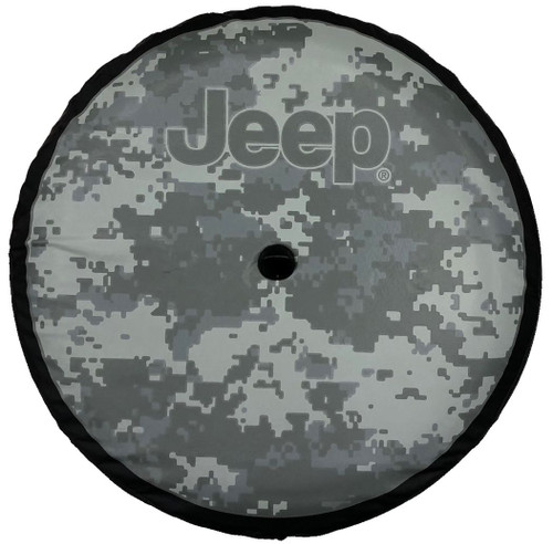 This Mopar tire cover is made of a durable black vinyl and features a digital camo pattern in shades of gray along with a prominent Jeep logo. Tire cover fits 245/75R17 and 255/70R18 tires and is compatible with the factory rear view camera system.