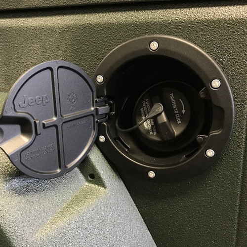 Dress up the look of your Jeep Wrangler with a new fuel filler door in your choice of chrome or satin black finish. The door mounts easily with no drilling and features the Jeep logo. The mounting ring, fasteners and other needed parts are included. Four versions are available: