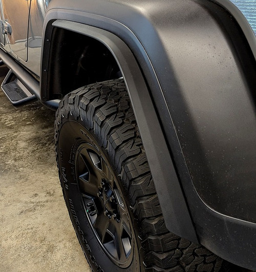 ***These wheel flare extensions are NOT a simple direct fit/bolt on item. They will require additional modification/customization of the wheel flare extensions as well as drilling into your wheel flares during installation to fit properly. The Front Extensions will also to be used on the rear on the Gladiator.***