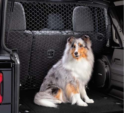 The Mopar Pet Partition keeps pets safely behind second row seats in your 2018-2025 4-Door JL Wrangler. Made of Black elastic netting, it stretches tightly across the vehicle and secures around sport bar with four elastic bungee loops, hooks onto hard top rail near both rear passenger doors and hooks to cargo tie downs or TrailRail sliders.